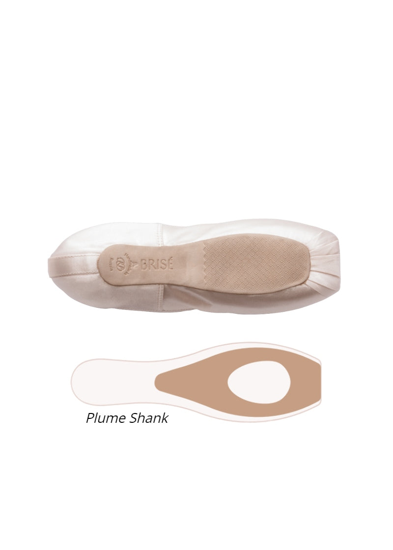 Feel like you're dancing on air with Russian Pointe's Brisé Pointe Shoe, featuring the innovative Plume shank that offers dancers lightweight, durable support with a flattering 3/4 effect.