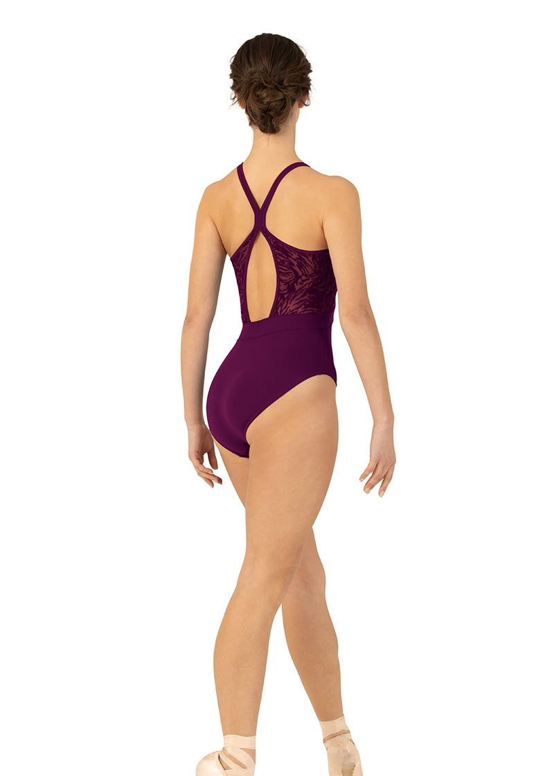 A bold flocked mesh bodice and strappy details take this classic camisole leotard to the next level! The flattering illusion neckline and open back complete the stunning silhouette of your new favorite leotard.